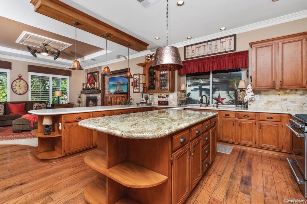 Enjoy the Murrieta lifestyle in this fabulous Single Story Ranch Style home. As you enter through the custom wood gates enjoy your tranqual/relaxing front porch covered with beautiful plants and flowers. Once inside you will find beaming hardwood floors, custom paint throughout, crown molding, brick accent walls, wood plantation, upgraded doors and hardware, whole house fan, Nest wireless thermostat and so much more! Spacious kitchen offers custom cabinetry, stainless steel appliances, reverse osmosis system, large island, large breakfast island with bar stools, granite counter tops & walk-in pantry. Off to the side is your small dining area that overlooks your fabulous backyard. Plus a large private dining room, perfect for large gatherings. Cozy up in your family room with brick fireplace with a rustic beam mantle, custom pull-down shades and 80% reduction solar window screens on all windows throughout. Master bedroom offers a sitting area and ensuite. Oversize walk in closet with custom built in's, upgraded master bathroom with spa tub, saparate shower, his/her own sinks, plus a vanity. 4 additional bedrooms with 1 offers your own bath, plus an offer nook. Laundry room with cabinets and sink. No expense spared in your 3 car garage with work shop! This garage definately has the WOW factors from the epoxy floors, to the custom cabinetry you will not be disappointed. On top of all of that, you will have room for an RV or boat plus a large storage shed. The backyard is fully landscaped with a 18 station irrigation control system, built-in natural gas fire pit and BBQ grill, pavers, 50% Sun Reduction Alumawood patio cover, several sitting areas, perfect for entertaining. Beautiful mature trees and plants throughout.
